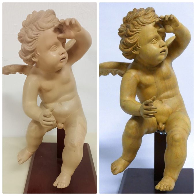 Los cuatro ángeles, obra de Rafael Barbero de mediados del Siglo XX, han sido sometidos a: documentación gráfica, limpieza, consolidación del soporte, eliminación de repintes, restitución volumétrica, estucado de lagunas, reintegración cromática, protección final, ajuste de brillos y sustitución del sistema de anclaje al paso.